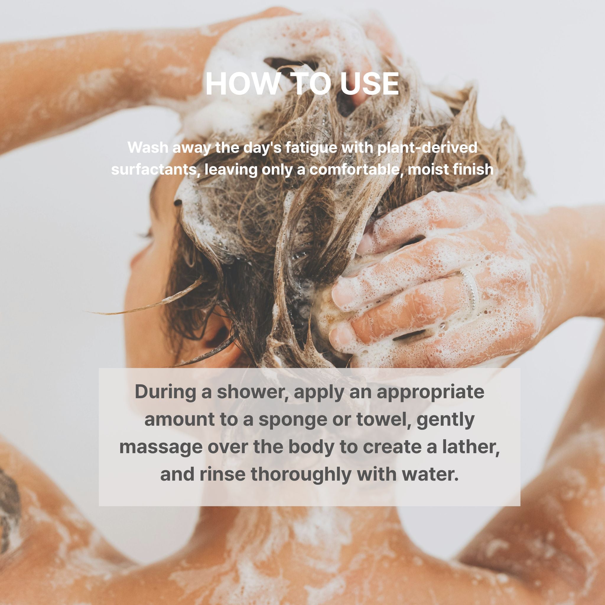 Gently massage the foam over your entire body to wash away the day's fatigue. The mildly acidic pH (5.0~6.0) ensures your skin barrier stays protected during cleansing.