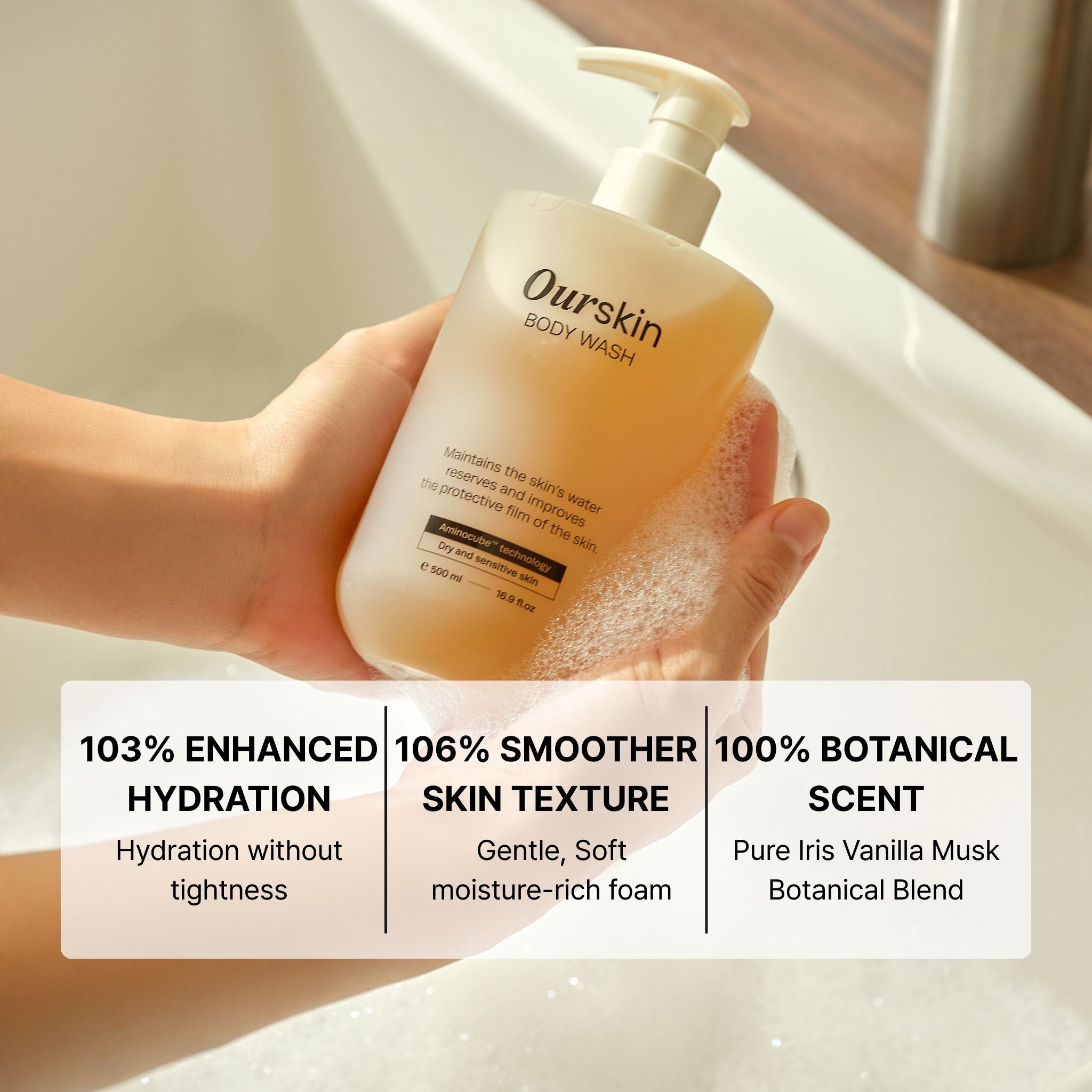 Gentle Deep Hydration for the Whole Family A skin barrier friendly body wash designed for daily use by the entire family. It gently cleanses away impurities while improving skin texture, boosting hydration, and reducing visible flakiness without post wash tightness.