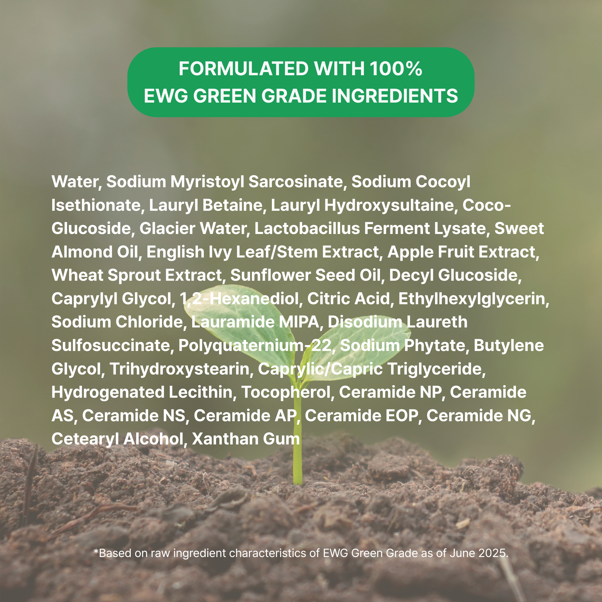 Water, Sodium Myristoyl Sarcosinate, Sodium Cocoyl Isethionate, Lauryl Betaine, Lauryl Hydroxysultaine, Coco-Glucoside, Glacier Water, Lactobacillus Ferment Lysate, Sweet Almond Oil, English Ivy Leaf/Stem Extract, Apple Fruit Extract, Wheat Sprout Extract, Sunflower Seed Oil, Decyl Glucoside, Caprylyl Glycol, 1,2-Hexanediol, Citric Acid, Ethylhexylglycerin, Sodium Chloride, Lauramide MIPA, Disodium Laureth Sulfosuccinate, Polyquaternium-22, Sodium Phytate, Butylene Glycol, Trihydroxystearin, Caprylic/Capric Triglyceride, Hydrogenated Lecithin, Tocopherol, Ceramide NP, Ceramide AS, Ceramide NS, Ceramide AP, Ceramide EOP, Ceramide NG, Cetearyl Alcohol, Xanthan Gum