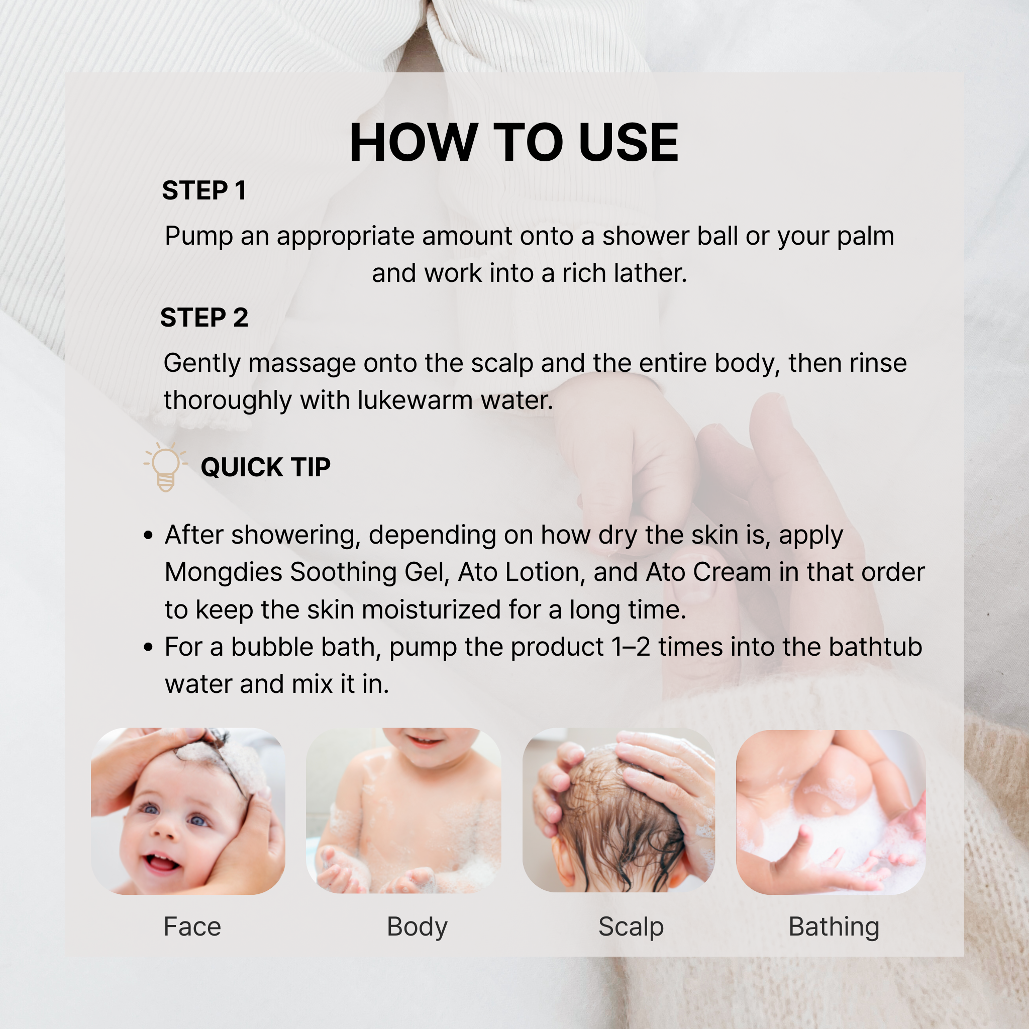 - After showering, apply Mongdies Soothing Gel, Ato Lotion, and Ato Cream in that order to keep the skin moisturized for a long time.