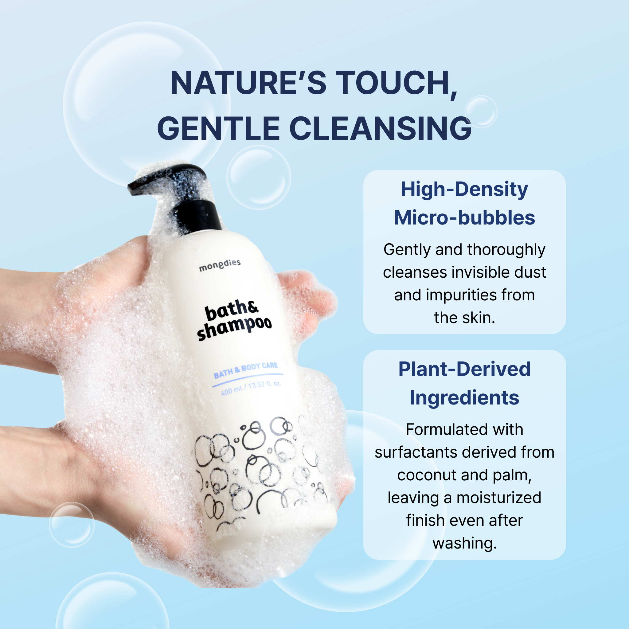 GENTLE CLEANSING, LASTING COMFORT A mild all in one bath and shampoo designed for delicate baby skin and sensitive scalp. Formulated with plant based surfactants and Lamellux cleansing technology, it gently removes impurities while helping maintain moisture and skin comfort after every wash.